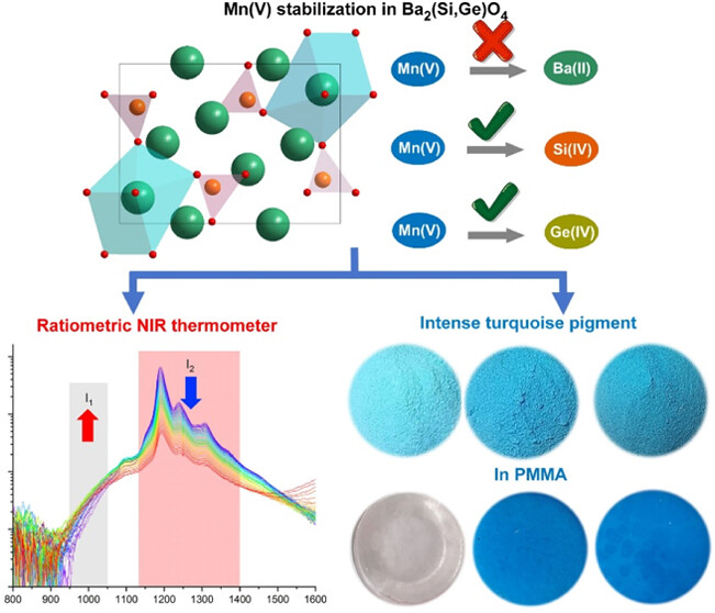 Luminescence of transition metal ions in unusual oxidation states is a treasure for developing new phosphors. Pentavalent manganese (Mn5+), which possesses a 3d2 electron configuration, has been reported less compared to its Mn2+ and Mn4+ counterparts due to the difficulty in its stabilization. In this study, Ba2(Si1–xGex)O4:Mn5+ phosphors were synthesized by a solid-state reaction method. The successful Mn5+ stabilization in the (Si,Ge)O4 tetrahedron leads to a bright turquoise body color with a strong NIR-II sharp-peak emission at room temperature. By replacing Si4+ with Ge4+, the peak position of the 1E–3A2 transition remains at 1181 nm, while the corresponding integrated intensity is enhanced by 150% at x = 0.6. First-principles density functional theory (DFT) calculations were performed to explore the geometrically optimized structure and electronic structure variation of the Ba2(Si,Ge)O4:Mn5+ phosphor. Then, they are discussed in association with the observed luminescence properties. It is found that modification of the host composition could modify the accelerated thermal quenching rate of the 1E emission. Temperature can be read from Mn5+1E vs 3T2 luminescence intensity ratios. This work represents a step toward exploring the unusual Mn5+ as the emitting center for the next-generation NIR-II phosphors and chromophores for new pigments.