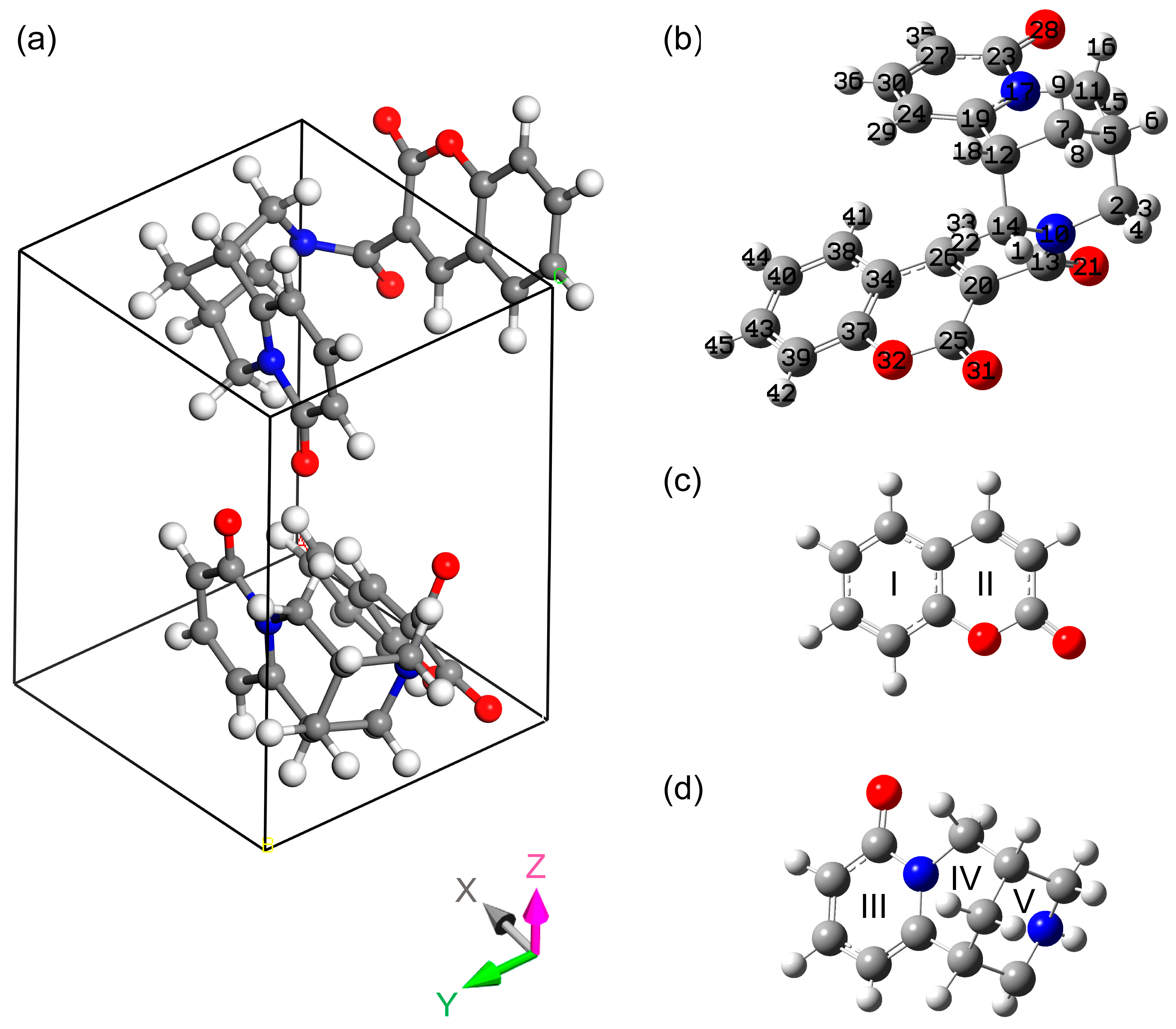 Coumarin and cytisine and their derivatives have significant biological activity. In addition, the electronic properties of coumarin derivatives are very sensitive to the molecular environment, which allows for their use as sensors for bioluminescent imaging. Due to the fact that cytisine exhibits high activity in binding to nicotinic acetylcholine receptors, a compound combining parts of cytisine and coumarin may have a broader spectrum of biological activity and also act as a photoactive element for promising use in optoelectronic devices. This article reports the synthesis of a crystalline cytisine–coumarin complex (IUPAC: N-(2-oxo-2H-chromene-3-carbonyl)cytisine), along with the results of both theoretical and experimental investigations of its structural and electronic properties. The structure of this new compound was established on the basis of X-ray diffraction and Fourier transform infrared spectroscopy data and was confirmed through density functional theory calculations using periodic crystal and single-molecule approaches. Interpretations of the IR absorption peaks and the atomic patterns of the vibrational modes are given. The electronic band structure and the contributions of individual atoms to the electronic density of states are analyzed. The structural and optical properties considered may be useful for quality control of the compound and for studying similar matrices.
